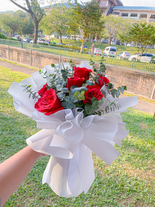 6 stalk Red Rose with eucalyptus