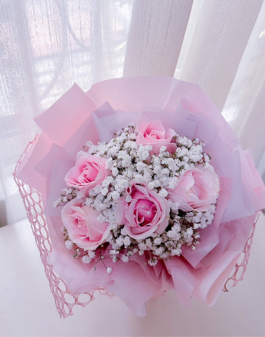 5 stalk pink rose with white baby breath