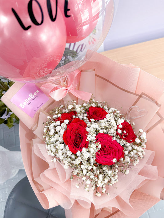 5 Stalk red roses with baby breath + bobo baloon