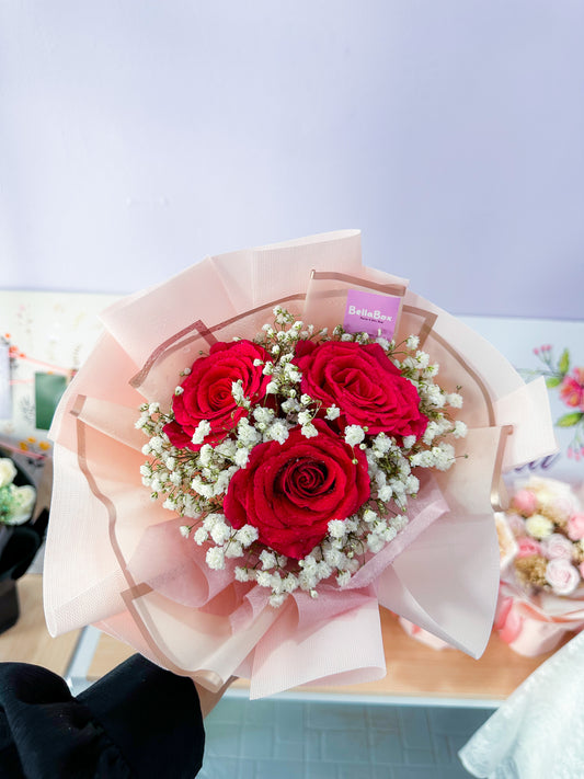 3 stalk red roses with white baby breath