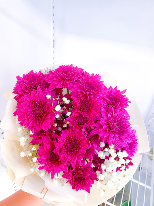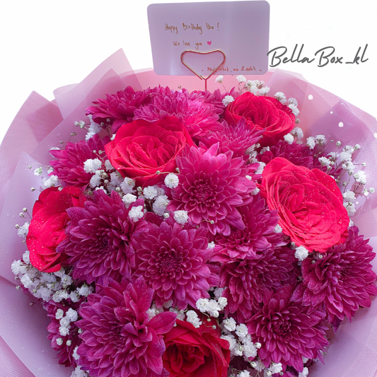 5 stalk Red roses with purple pom pom & baby breath (M Size)